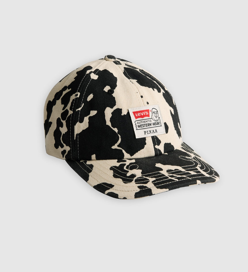 This limited-edition Cow Hat features Toy Story patches, custom western stitch detailing at the brim and a leather strap closure with custom embossed Pixar ball brass. Plus, it's designed with a randomly selected patch featuring your favorite characters and comes in ecru cow print fabric.