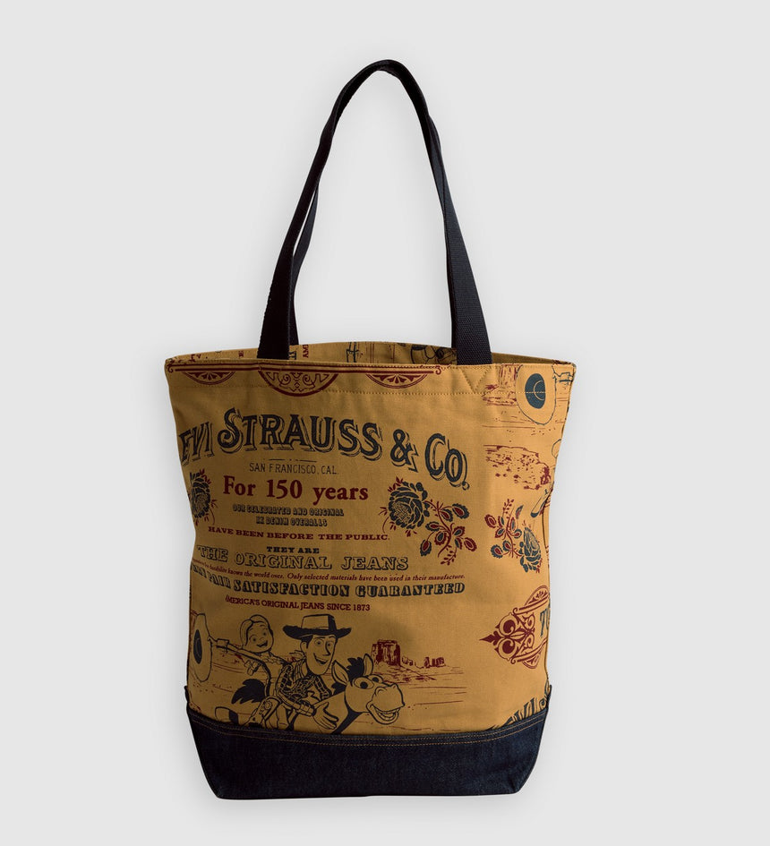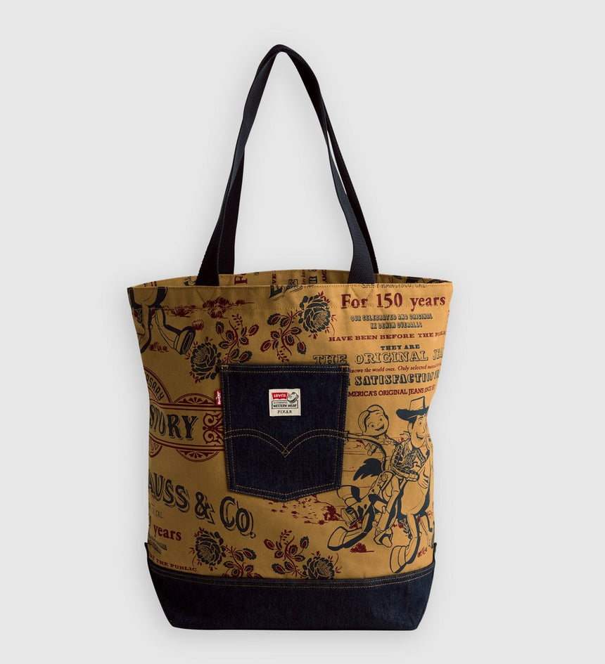 This limited-edition Tote Bag combines denim and flour sack printed canvas, a patch pocket and arcuate detailing.