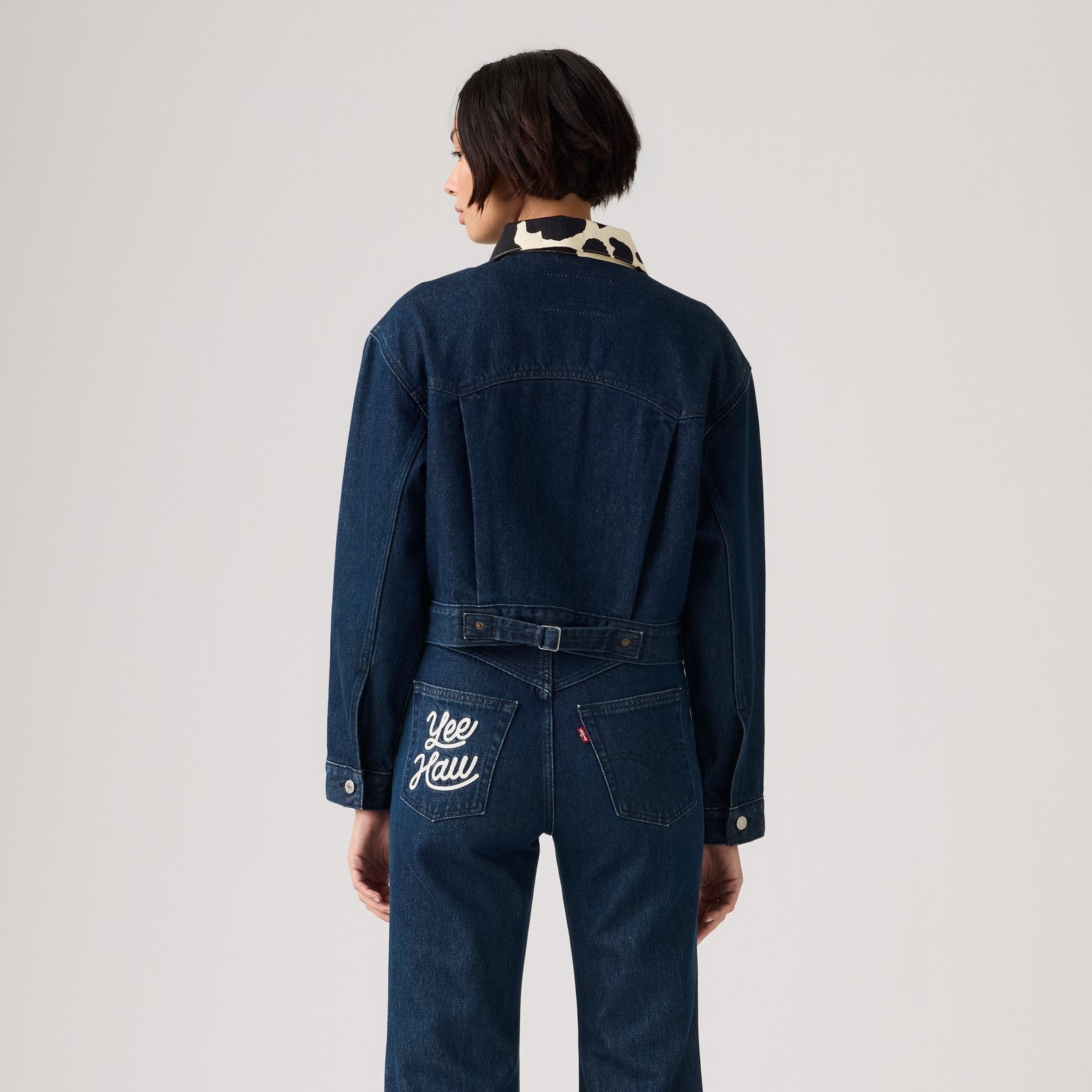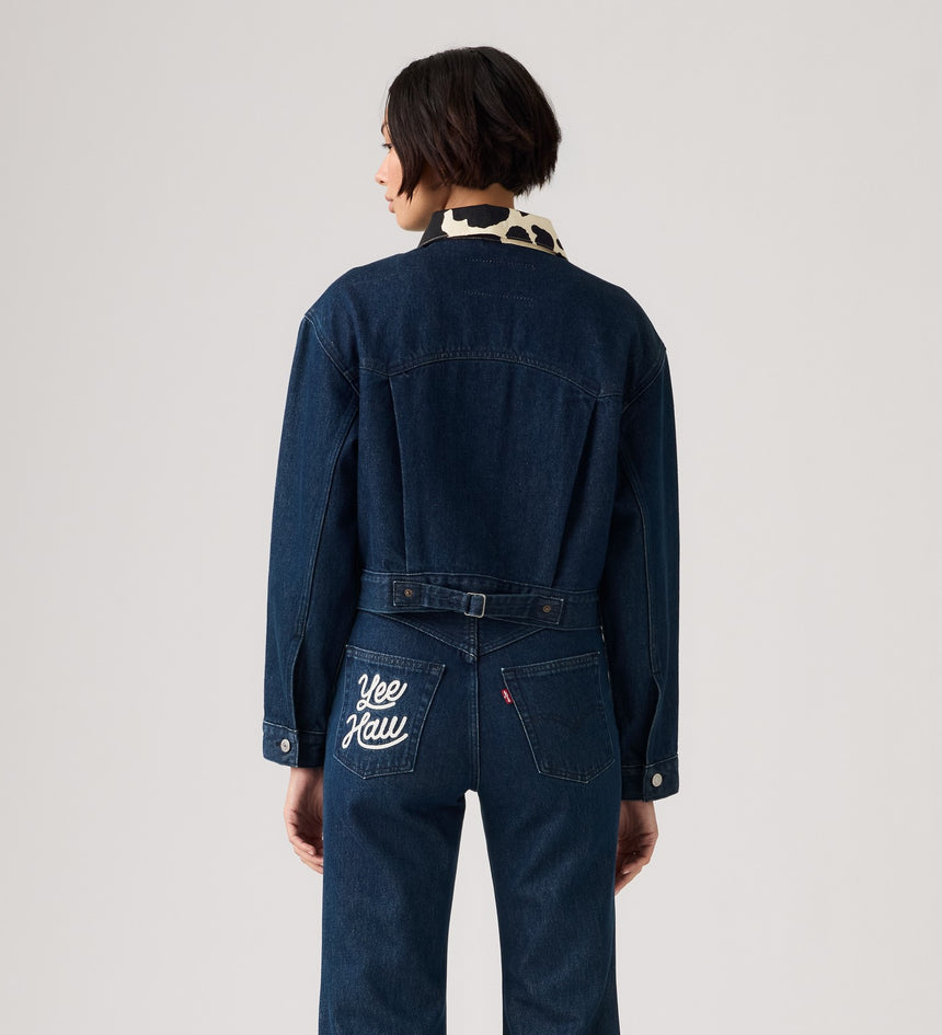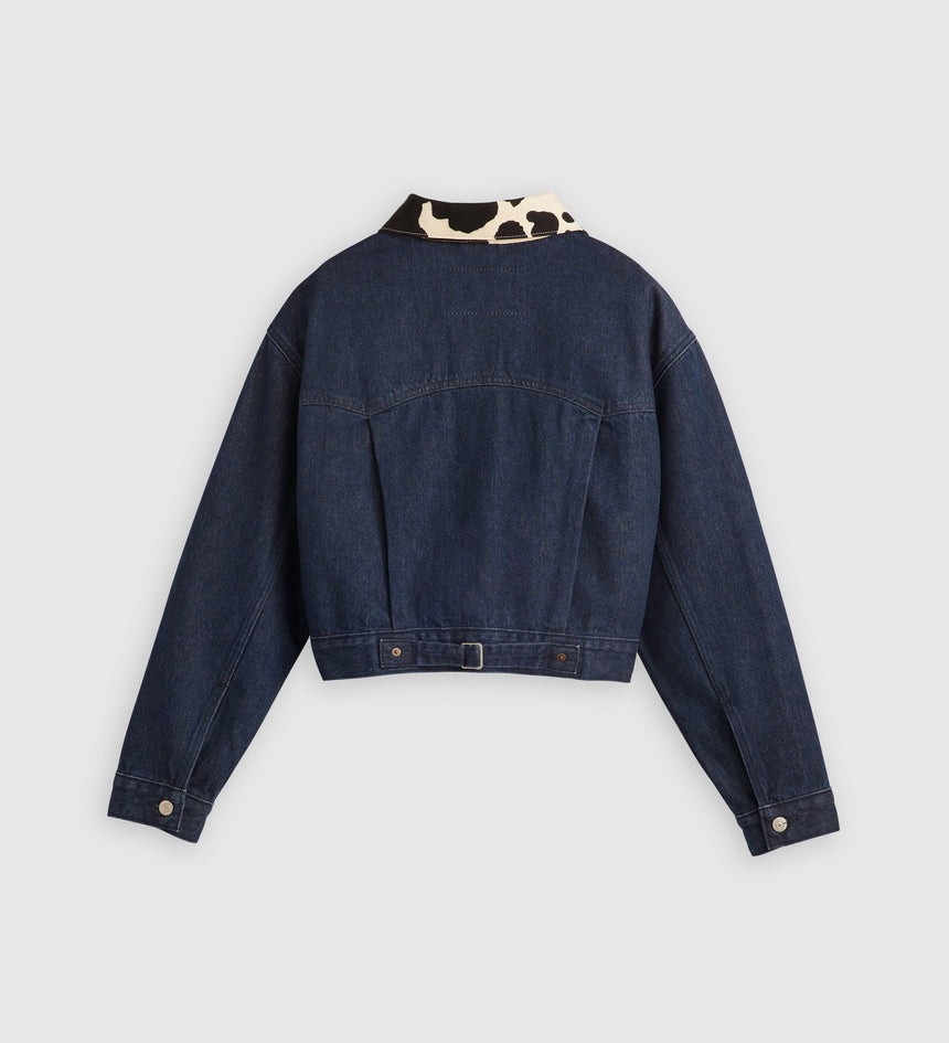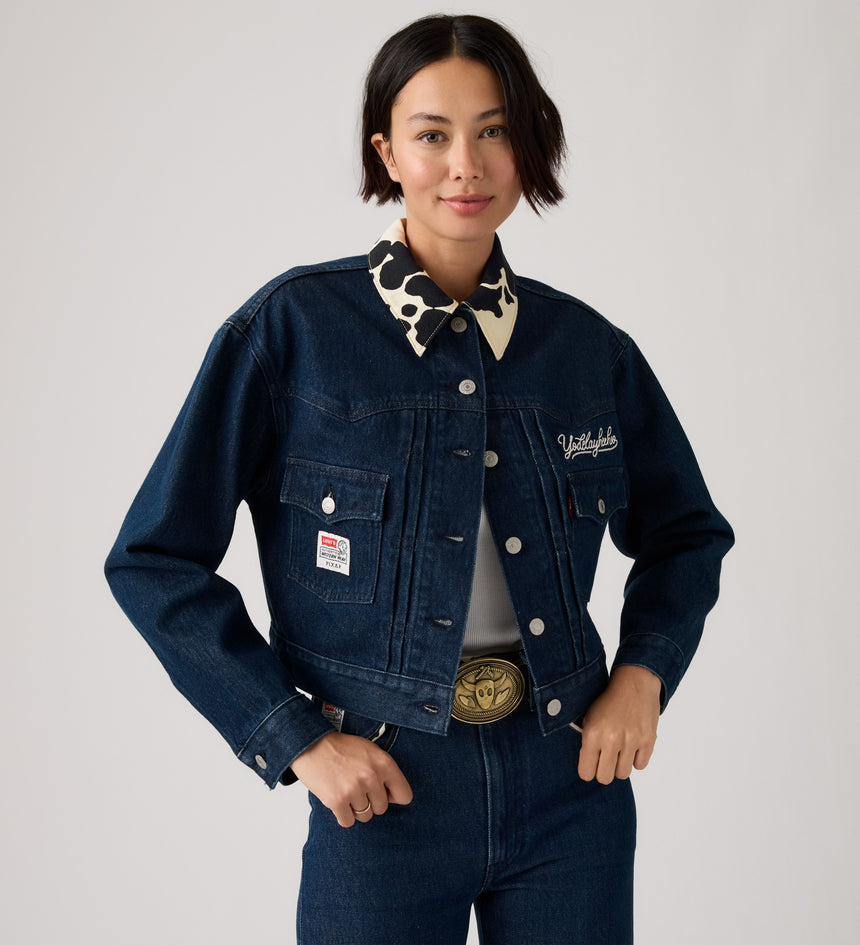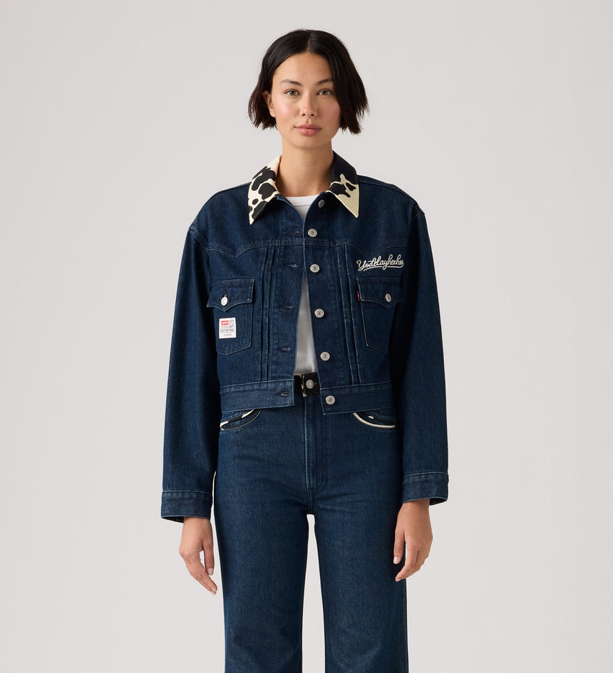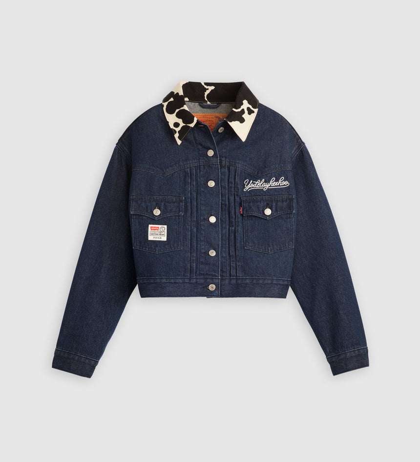 This limited-edition Type II Trucker Jacket is made with dark rinsed indigo denim and features a cropped western silhouette, a one-of-a-kind "Yodalayheehoo" chain stitch embroidery and a cow print collar.