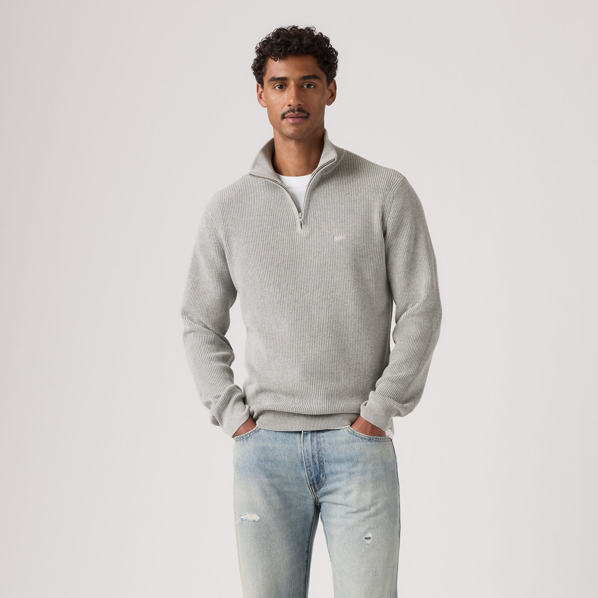 The modern essential: our Housemark Quarter Zip Sweater. We designed it with an easy, standard fit and soft, ribbed knit for comfort.