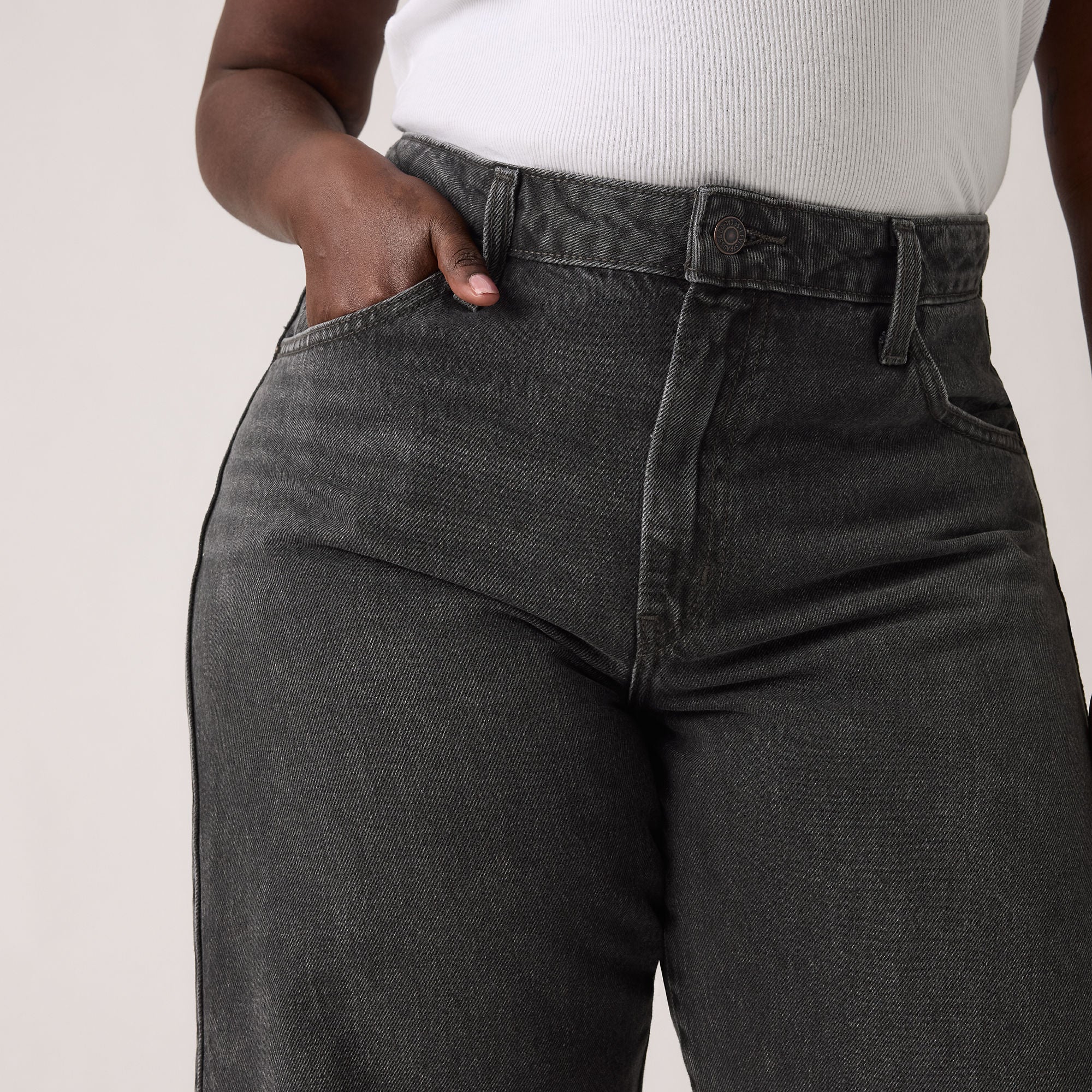 - Roomy and slouchy through the hip and thigh
